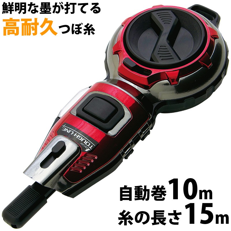途切れず鮮明な墨が打てる耐久性の高い糸です。糸の保水力が高く、墨を付け直さずに連続した墨打ち作業が可能です。新ロック機構採用でタンクフタがスムーズに開閉でき、糸通しが不要です。ワンタッチ式の糸ガイドで、隅までラクラク墨打ちができます。つぼ糸の押さえ口が斜めにカットされており、糸押さえの時にも手の返しが少なく済み、位置合わせも簡単です。濃く鮮やかな墨が打てる「墨付けボタン」付です。ゴムパッキン使用の密閉型タンクで墨漏れを防ぎます。別売の専用のホルダーに収納できます。
