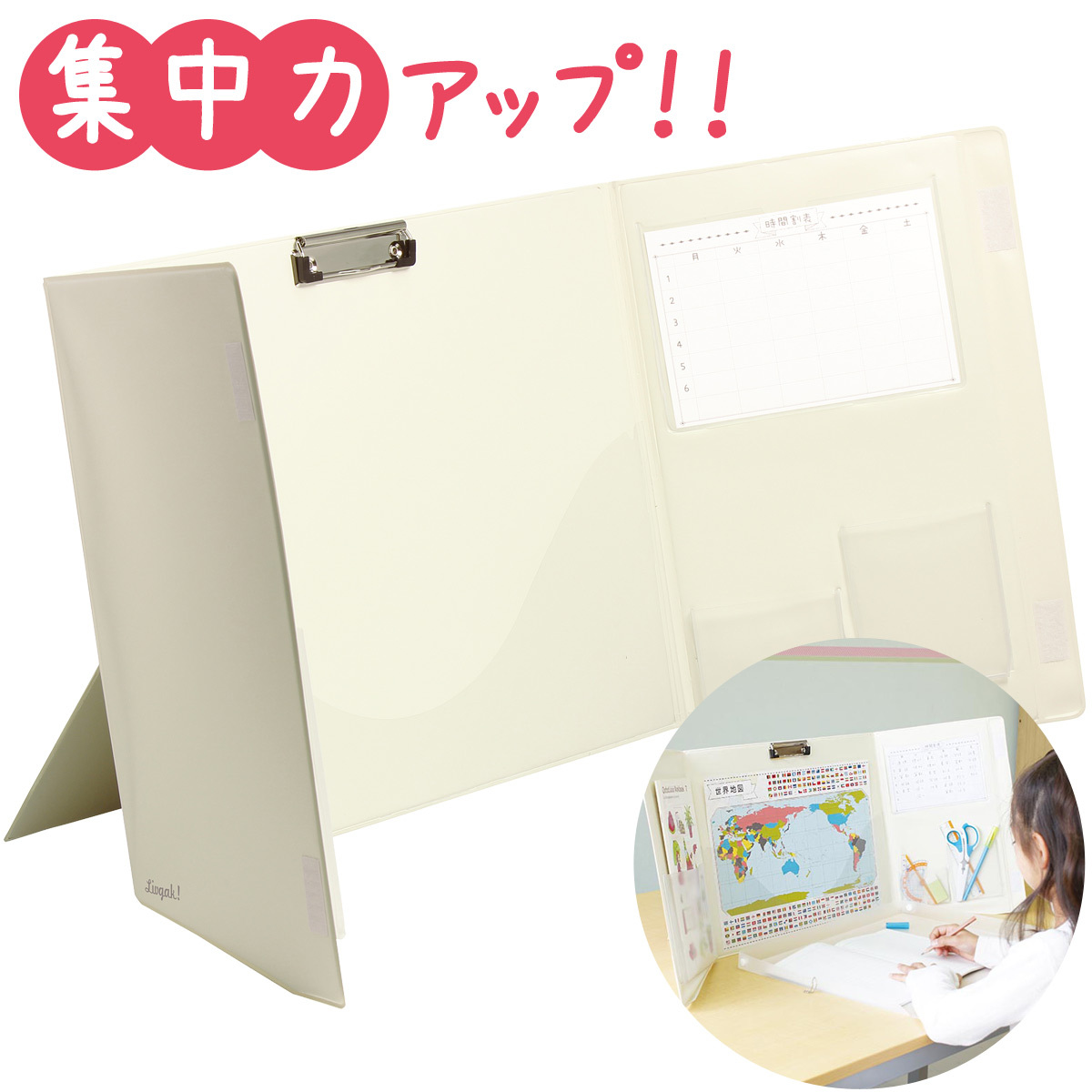ノートやプリント、筆記用具を収納できます。斜めに傾いているので手元が暗くなりにくく、脚があるので倒れにくい!プリントをはさめるクリップやポケット、時間割表つき