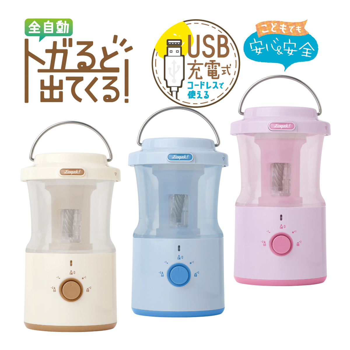 全自動で鉛筆がトガると出てくる!こどもでも安心&安全えんぴつ削り♪鉛筆を差すだけで自動で引き込み→削り上がると自動で排出!力の要らないハンズフリー乾電池のいらないUSB充電式 未充電からの充電時間約90分(接続先の機器等によって充電時間は異なります)充電後はコードレスで持ち運びしやすい 満充電で約600回削れる(※連続使用時)モーターの熱を感知すると電源を遮断!オーバーヒート防止機能フタが開いている時は動かない 電源遮断安全機構倒れてもゴミが散らばらない ダストケースロック機構短い鉛筆が詰まっちゃった!そんな時も中身が救出しやすい設計(※必ず大人の方が手袋などをして行ってください)六角・三角・丸型の3種類の鉛筆に対応しています。かわいいランタン型で、お部屋のインテリアにも馴染むデザイン