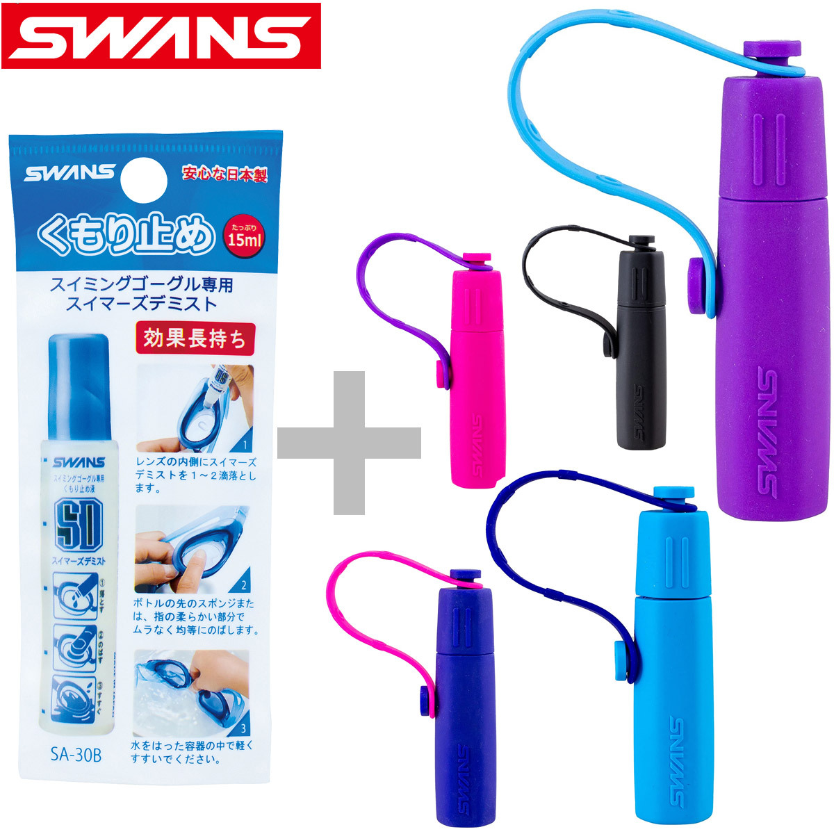 スイマーズデミスト (くもり止め液)塗ってのばすスティックタイプレンズのくもりが気になりだしたら簡単メンテナンススリムなボトルの微香性タイプで、天然油脂を原料にしており、人体に有害なものは含まれておりませんので、安心してご使用していただけます。スイマーズデミストケースケースに入れることで転がりにくく、友達とも間違えにくくなります。また、カバンにも取り付けることができるため探す手間もなくなります。※SA-30B専用です。SA-33Bにはお使いいただけません。