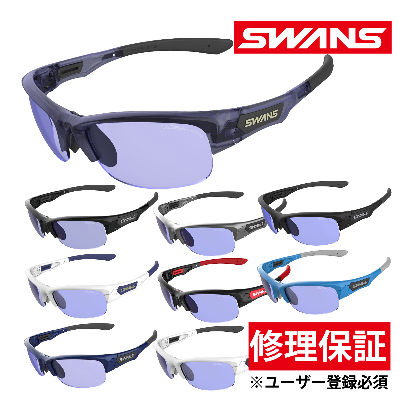 レンズセットアップシステム現代日本人に最もフィットしやすいサイジングで、男女ともに使用できる流麗なデザインの「SPRINGBOK(スプリングボック)」レンズ交換可能で、開閉パーツはフレームデザインと見事に一体化し全体のフォルムを崩しません。テンプルエンドがフレキシブルに動くので、頭部の形状に合わせてが調節可能。頭を包み込むようなフレーム設計のためズレにくく、締めつけないフィッティングを実現します。鼻パットは汗をかいてもずれ落ちにくく、肌触りも柔らかな大型ラバーを採用。内部に金属の芯があるため幅広く、シビアな調節も可能です。アスリートの求める視界を確保し、そのパフォーマンスを最大限にサポートする。プロも認めるフルスペックのスポーツグラスです。【レンズ】偏光レンズレンズに特殊なフィルターが挟み込まれたレンズです。日光が水面や路面、植物の葉の表面などに反射したギラギラした反射光をカットします。余計な光をカットして景色をスッキリと見せる効果があります。【ULTRAアイスブルー】SWANS独自の視認性を高めたULTRAレンズです。「ULTRAアイスブルー」は白や黄色、赤といったカラーがはっきりと見えるカラー。ゴルフやテニスなどボールスポーツにも最適です。【両面マルチ】レンズ表裏両面にマルチ(反射防止)加工が施されているレンズです。光の映り込みを抑えてクリアな視界を確保します。【フレーム】レンズ交換機能、ノーズ調整、テンプル調整などフルスペックのSWANSフラッグシップモデル。