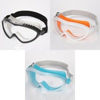 ソフトリムゴーグルの特徴・防爆形・上下ダイレクトベンチレーション付・25mm巾広布バンド(長さ調整式)・バンド(連結部品付)交換可・メガネ併用可・マスク併用可・アイピース交換可・耐衝撃PC球面2mm厚、両面くもり止めアイピース入り