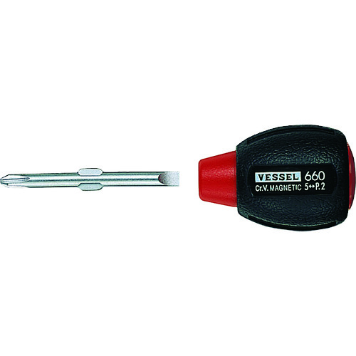 手作業工具 ドライバー・六角棒レンチ スタビードライバー ●電工用をはじめ、整備用・一般用としてあらゆる使用に役立つ万能タイプです。●黒クロムメッキ仕上げです。●刃先:[[−]]5、[[+]]2●軸長(mm):60●全長(mm):78●先端マグネット:入り●全身焼入●先端:マグネット入り●軸:クロムバナジウム鋼●グリップ:ポリプロピレン、エラストマー樹脂
