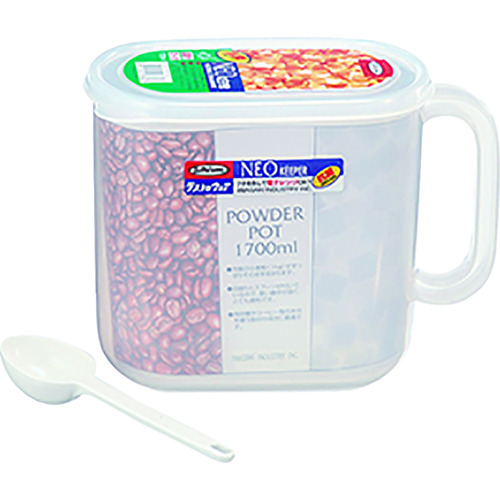 研究用品 厨房用品 容器 ●安全な無機系抗菌剤を使用しています。●フリーザーから電子レンジ加熱まで対応します。(フタは電子レンジ不可)●密着性の良い特殊配合の原料を使用したフタを使用しており高い密封性能がございます。●ダ円型で本体はつかみやすい取手付きです。約大さじ1杯のスプーンが付属しており大型調味料ポットとして便利な形状です。●しお、さとう、小麦粉、パン粉のシール付きです。●食品などの保存・保管用に。●容量(L):1.7●外形寸法(mm)幅:192●外形寸法(mm)奥行:106●外形寸法(mm)高さ:149●色:半透明●耐熱温度(℃):(本体)-20〜140℃●耐熱温度(℃):(フタ)-30〜60℃●本体・スプーン:ポリプロピレン(PP)●フタ:ポリエチレン(PE)●スプーン(15cc)1本●電子レンジ使用時は必ずフタを外してください。●フタは電子レンジ使用不可
