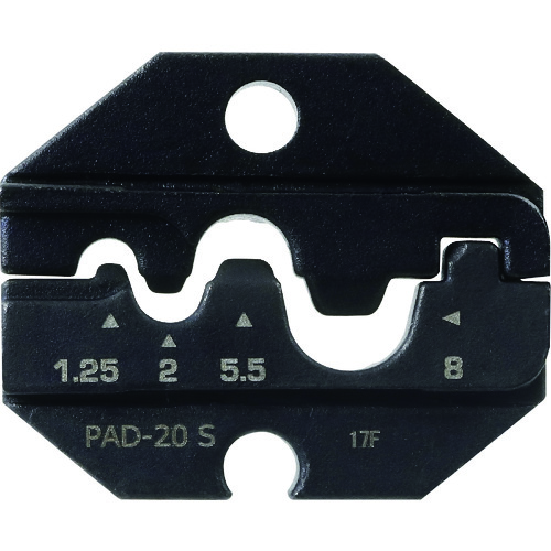 手作業工具 電設工具 圧着工具 ●PAD-20〜22用の交換ダイスです。●ダイスを交換することで、多くの端子に対応。持ち運ぶ工具本体を減らせます。●裸圧着端子、PBスリーブの圧着に。●圧着端子([[MM2]])裸端子用:1.25、2.0、5.5、8.0●適合機種:PAD-20●ダイス交換式ラチェットクリンパー用交換ダイス