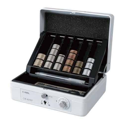 環境改善用品 防災・防犯用品 金庫 ●錠前とダイヤル錠での安心の二重ロックです。●コイントレーは10枚ごとに仕切りがつき、庫内で立て掛けて使うことができるので、金銭の取り出しがスムーズに行えます。●上蓋の背面側にあるスポンジにより持ち運び時の硬貨の飛散を防止します。●コイントレーの下はA6サイズまで収納できるフリースペースで、紙幣も折らずに保管できます。●容量(L):0.4●色:ホワイト●本体寸法(mm)間口:195●本体寸法(mm)奥行:155●本体寸法(mm)高さ:87●有効内寸(mm)間口:164●有効内寸(mm)奥行:110●有効内寸(mm)高さ:27●施錠:錠前、ダイヤル錠●収納書類サイズ:A6サイズ●立掛けコイントレー●硬貨飛散防止●10枚区切りコイントレー●硬貨収納枚数:500円50枚、100円50枚、50円50枚、10円50枚、5円50枚、1円50枚●冷間圧延鋼板(SPCC)、ABS樹脂●鍵2個●有効寸法はトレーが入った状態でのサイズとなります。