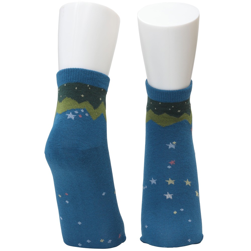 夏の星座、はくちょう座・こと座ケフェウス座をデザインした宙ソックス季節の星空をさりげなく柄になるようにデザインしたソックスです。くるぶし丈で使いやすく、スポーティーなスニーカやアウトドアウェア、デニムなどのカジュアルウェアなどにコーディネートしやすい色味とデザインです。星座や流れ星のデザインは表だけではなく、足の裏側や足首までしっかりと表現しています。星空のデザインごとに夜空の色を変化させて、可愛らしい配色にしました。