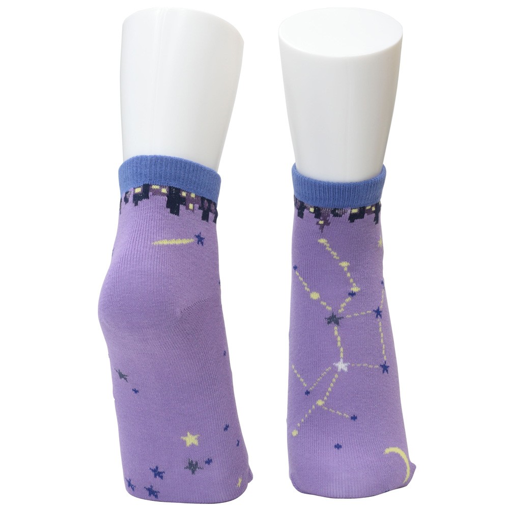 秋の星座、ペガスス座・アンドロメダ座、月をデザインした宙ソックス季節の星空をさりげなく柄になるようにデザインしたソックスです。くるぶし丈で使いやすく、スポーティーなスニーカやアウトドアウェア、デニムなどのカジュアルウェアなどにコーディネートしやすい色味とデザインです。星座や流れ星のデザインは表だけではなく、足の裏側や足首までしっかりと表現しています。星空のデザインごとに夜空の色を変化させて、可愛らしい配色にしました。