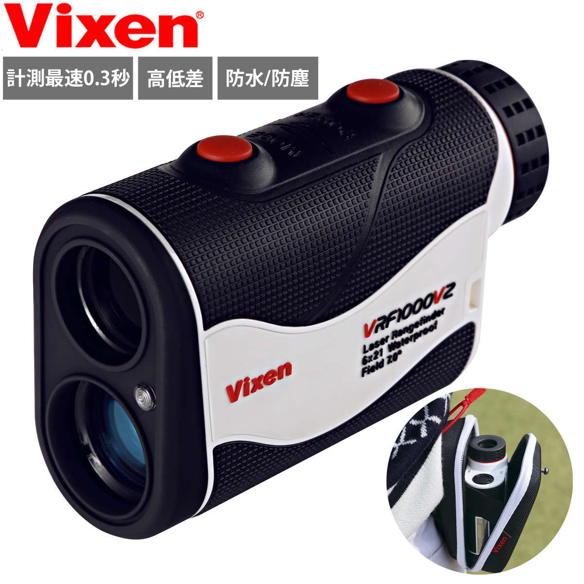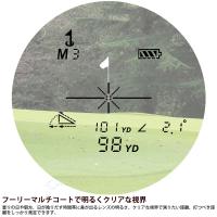 防水・防塵 IP54基準急に降り出した雨の中でも安心して使用できるIP54基準をクリア。対物レンズと接眼レンズには水切れの良い撥油コートを施しています。軽量・コンパクト107×69.5×39mmのコンパクトサイズ。ポケットにすっぽり収まり、167gと軽量で携帯性に優れています。上面と底面をラウンド形状にし、さらにグリップの良いラバーカバーを施すことで女性の小さな手にも吸い付くようなホールド感。フーリーマルチコートで明るくクリアな視界曇りの日や朝方、日が陰りだす時間帯に差が出るレンズの明るさ。クリアな視界で測りたい距離、打つべき距離をしっかり測定できます。ハイアイポイントで見やすいスケール表示メガネやサングラスを付けたままでもスケールを見やすくするために、スケール表示を見やすい位置に集めました。照準インジケーター周りはしっかりとピンを捉えられるよう、スペースを確保しています。最短測距時間0.3秒1000mまでの距離を測定することができます。対象物(測定対象)までの距離測定時間は、最短僅か約0.3秒。(ピンシーク時の最短測距は0.5秒)測定終了後にバイブレーションと指標マークを点滅させる事で、視覚的にも分かりやすくなりました。ダイレクト測距とピンスライド測距ピンシーク機能※では、「ピンダイレクト測距」と「ピンスライド測距」の2つの測定方法を搭載。「ピンダイレクト測距」では、ピンの方向へ向かって長押しすることで、自動でピンを探し出し、距離を測定します。さらにピンが遠くにあり、手ブレで捉えることが難しいときには、もう1つの測定方法である「ピンスライド測距」が便利です。スイッチを長押ししながらピンの周辺をスライドすることで、ピンまでの距離を測定します。ピンを見つけた時点でブルっと振動するため、スピーディにストレスなく測定できます。※ピンシーク機能とは:ピンの後ろに樹木や建物などがある場合も、正確にピンまでの距離を測れる便利な測定機能です。VRF1000VZでは、「ピンダイレクト測距」「ピンスライド測距」の2つの方法で測定できます。煩わしいピント調整は1回でOKピント範囲が広く、1回目のプレー時にピント調整を行えば、その後プレー中に再度ピント調整が不要。ストレス無くプレーに集中できます。競技対応可能で3モード搭載競技に使用できる「通常モード(モード1/M1)」と、「ピンシークモード(モード2/M2)」を使用中は、対物レンズ側のライトが点灯します。「スロープとピンシーク機能の両方が作動するモード(モード3/M3)」は、打ち上げや打ち下ろしを自動計算し、打つべき距離を表示します。モード3使用時はライトが消灯します。オートパワーオフスイッチオンの状態から30秒間動作しないまま放置すると、自動で電源がオフになります。距離を測ったあと、電源のON/OFFや電池の消耗を気にせず収納いただけるため、煩わしさがありません。連続測定5000回以上の省電力スイッチオンの状態から30秒間動作しないまま放置すると、自動で電源がオフになります。距離を測ったあと、電源のON/OFFや電池の消耗を気にせず収納いただけるため、煩わしさがありません。