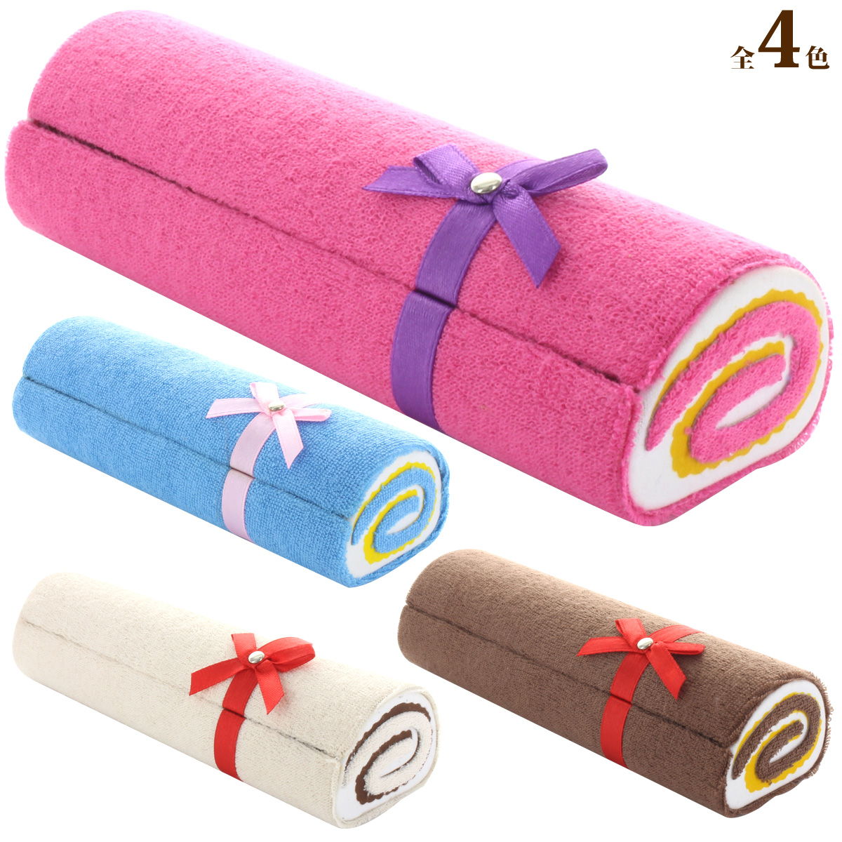 食べたくなるロールケーキ風のケース、ふわふわ感とキュートなリボン付きでかわいい。