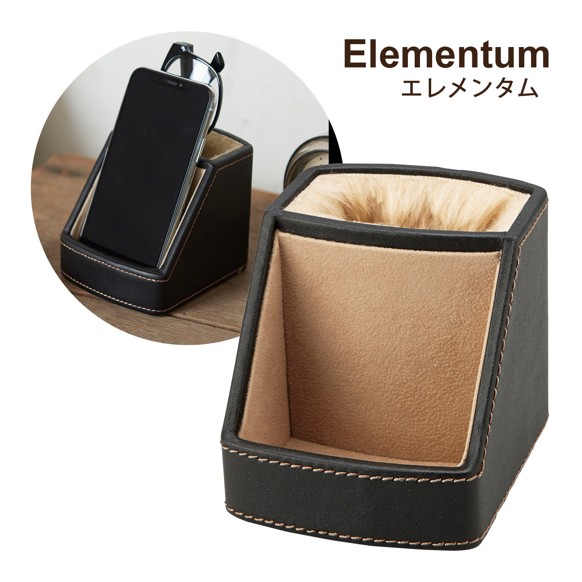 シックなスタイルで決める、メンズコレクション。ブラックの生地にブラウンのステッチが上品な携帯&メガネスタンド。サイズ:高さ90×幅90×奥行110mm