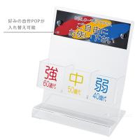 受付などに定番のわかりやすいスタンドデザイン。自作POPなどに入れ替えが可能です。サイズ:W162×D120×H190mm