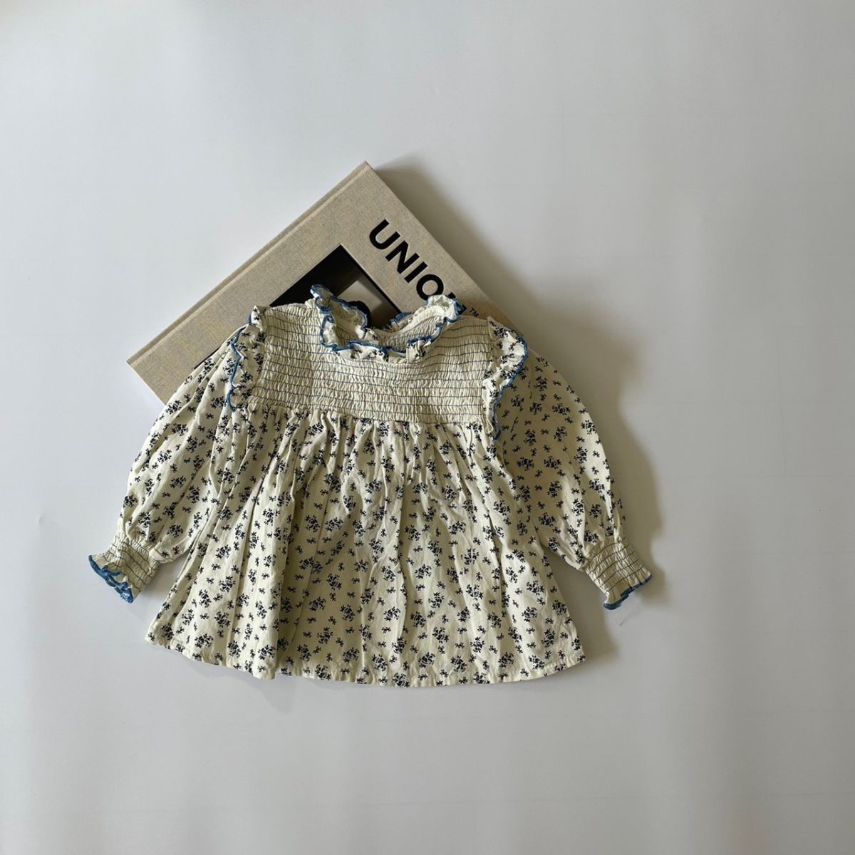 キッズ ベビー 女の子 花柄 ブラウス プルオーバー blue flower tops シャツ トップス フリル シャーリング ブルー 青 ヴィンテージ 小花柄 レース ガーリー