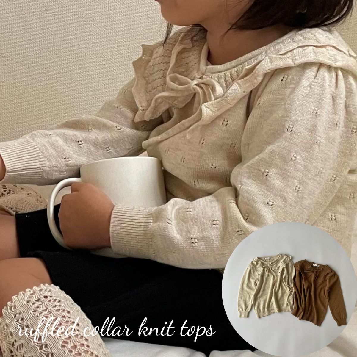 キッズ ベビー 女の子 ニット トップス_ruffled collar knit tops ラッフルカラー 襟 リボン クロシェ 透かし編み コットン 可愛い 70cm 80cm 90cm 100cm 110cm