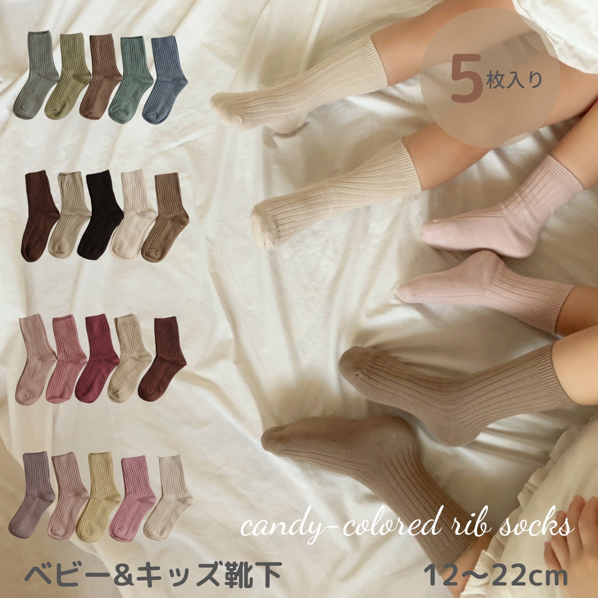 ベビー キッズ 靴下 ソックス 5足 セット candy-colored rib socks 落ち着いた色合いが可愛い靴下 リブ おしゃれ かわいい 女の子 男の子 12〜18cm シンプル