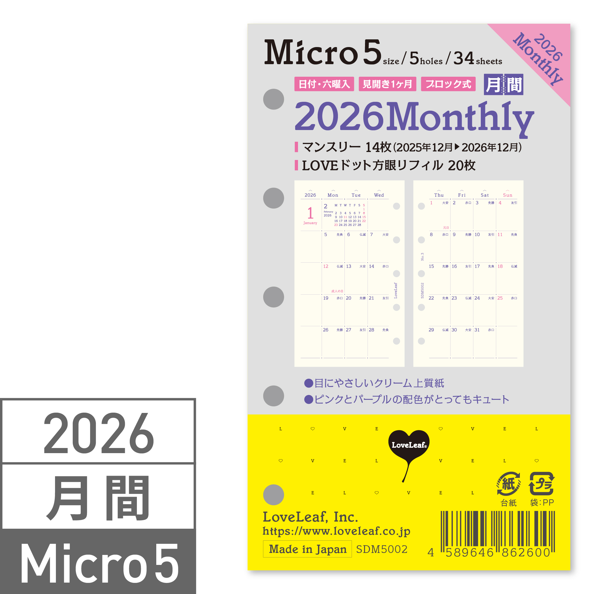 システム手帳 マイクロ5 2026年 マンスリー リフィル 月間ブロック式 5穴 ミニ5 M5 mini5 ダイアリー ラブリーフ