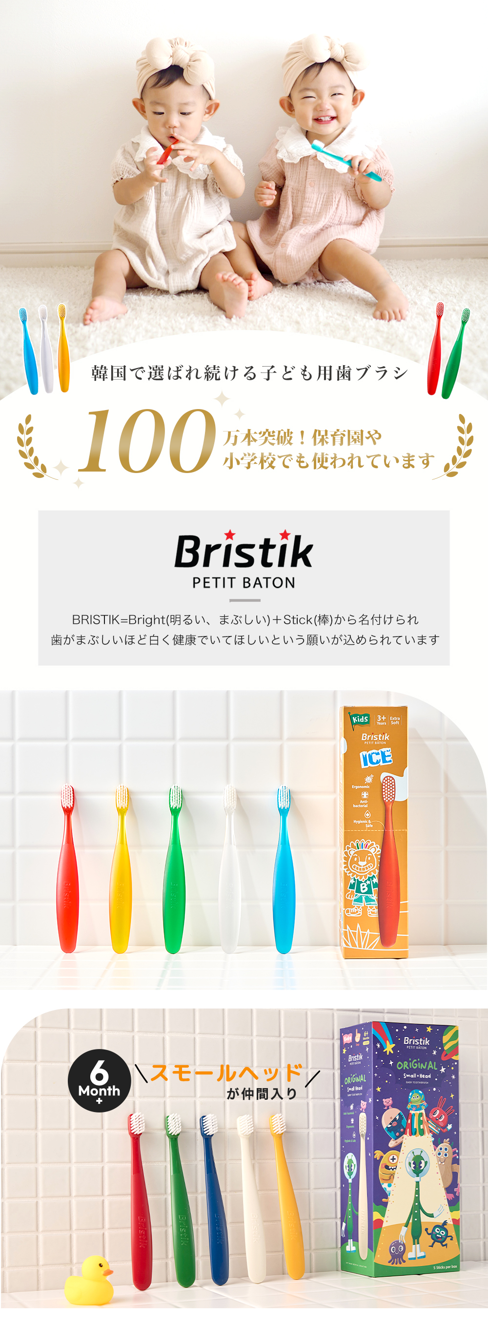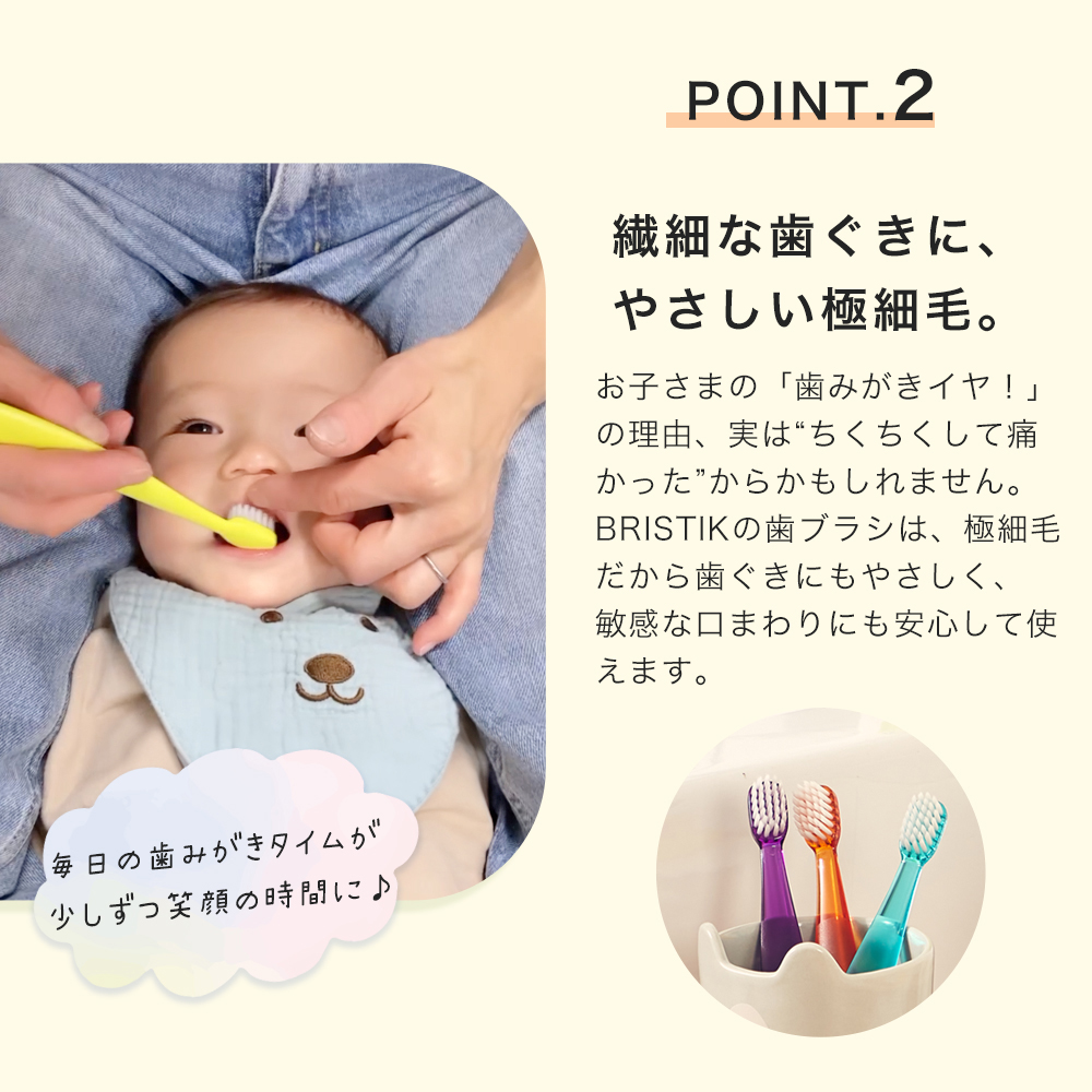 ◆Bristik歯ブラシBristik歯ブラシは Bristik=Bright(明るい、まぶしい)+Stick(棒)から名付けられ、歯がまぶしいほど 白く 健康 でいてほしいという願いが込められています。