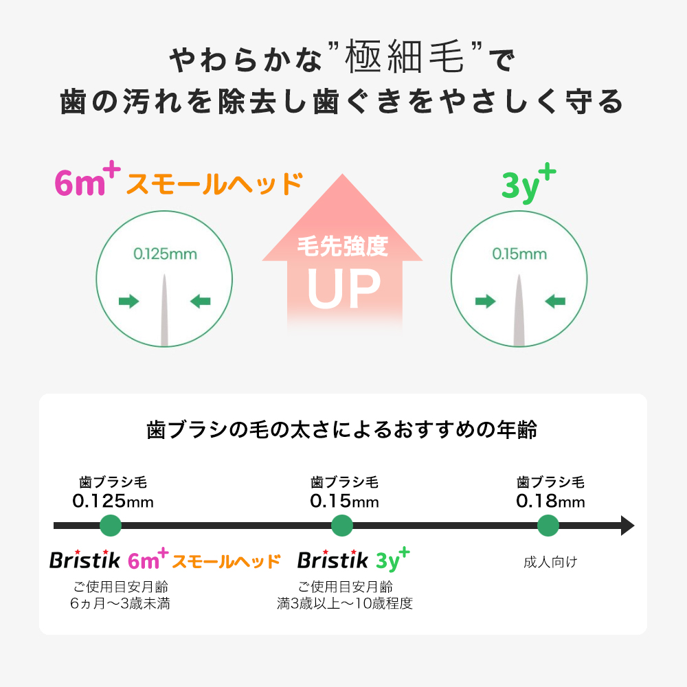 【6ヵ月〜3歳未満】【3歳〜10歳頃】を目安に子供の手と口の成長にあわせて研究し開発された歯ブラシです。