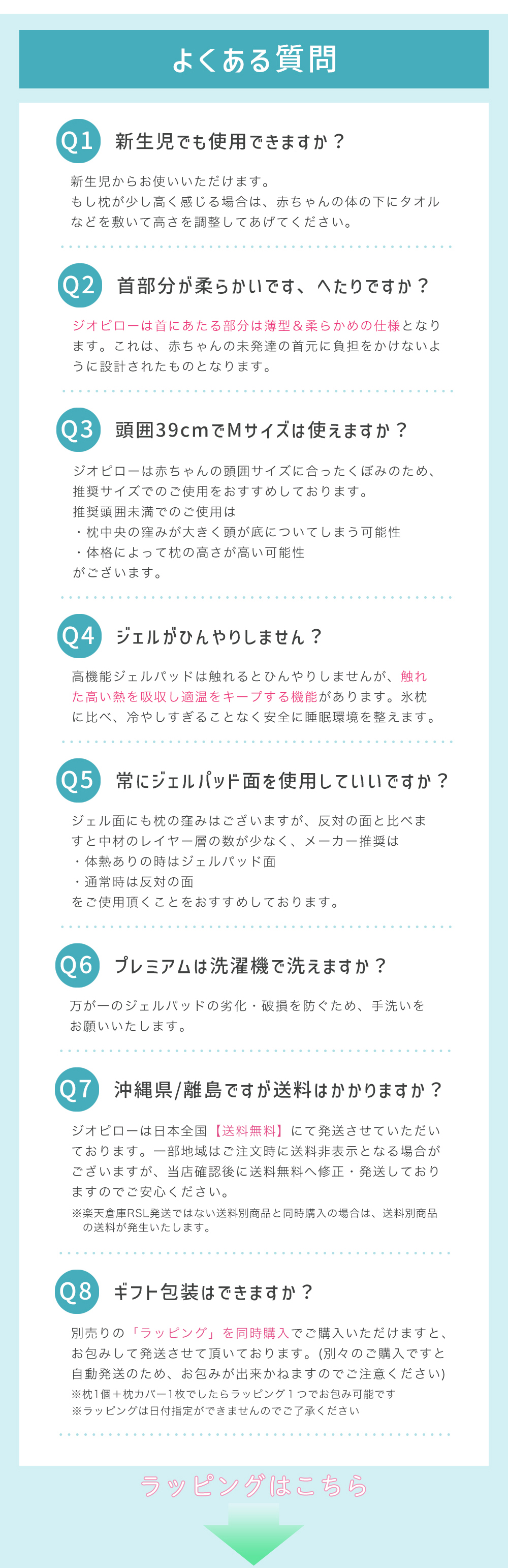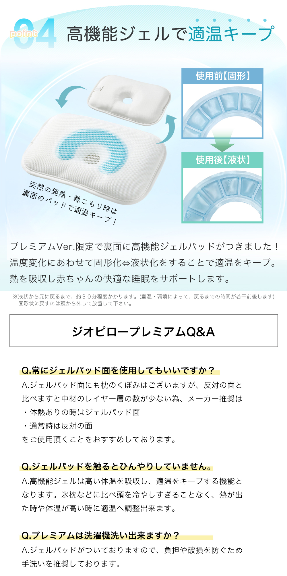 | 【科学的につくられたジオピロー】 赤ちゃんの頭はとてもやわらかく、寝ているあいだのわずかな圧力でも、 知らないうちに頭の形が歪んでしまうことがあります。 だからこそ、新生児のうちからしっかりとケアしてあげることが大切です。 ジオピローは、赤ちゃんの頭囲に合わせて枕の中心にくぼみが設計されているため、 調整の手間がなく、やわらかい赤ちゃんの頭をやさしく包み込みます。 これにより、自然でバランスの取れた頭の形へと導きます。 さらに、3D立体レイヤー構造が後頭部にかかる圧力を分散し、 重さを全体で支えるドーナツ型の構造により、頭部の変形をしっかりと防ぎます。 GIO PILLOW Premium 特許取得のくぼみは頭の形にフィットし絶壁頭を予防 もう片面には過酷な環境でも体温を一定に保つ効果がある高機能のジェルパッドを使用 体温にあわせて固形化・液状化に変化し適温をキープ ●製品内容 枕本体1個+カバー1枚 ●本体サイズ Sサイズ 約200×300×40mm (0-6ヶ月向け) 適合目安:頭周り40cm以下 Mサイズ 230×330×60mm (6-24ヶ月向け) 適合サイズ:頭周り41cm以上 ●箱サイズ 約355×263×70mm ●製造 韓国 デザインや仕様は改善のため予告なく変更する事があります ●ジェルパッド面について ジェルパッド面にも枕のくぼみは御座いますが、 反対の面と比べますと中材のレイヤー層の数が少なく メーカー推奨は ・体熱ありの時はジェルパッド面 ・通常時は反対の面 をご使用頂くことをおすすめしております。 また、ジェルパッドは熱を吸収し適温をキープする機能となります。 冷たい 、 ひんやり といったものに比べ冷やしすぎを防ぎ赤ちゃんの快適な温度を手助けします。 ●お手入れについて ジェルパッドがついている為、洗濯は手洗いを推奨しております。 ・枕カバーはネットへ入れ洗濯機洗い可能、枕本体は手洗い可能です。 ・枕は30℃以下の水につけて、ベビー用洗剤を使い、全体を押し洗いしてください。 ・押し洗い後きれいな水で数回すすいでください。 ・乾燥させる時は物干し竿などに吊るし、直射日光を避け、陰干しで干し中までしっかり乾燥させてください。 ●注意事項 ・商品写真は出来る限り現物に近くなるよう努めておりますが、お使いの環境(モニター/ブラウザ等)の違いにより色の見え方が実物と異なる場合が御座います。 ・生地の柄の出方は裁断位置により個々に異なります。また、生産ロットにより色の誤差がある場合が御座います。 ・デザインや仕様は改善のため予告なく変更する事があります。 ・ ベビー枕が高すぎると感じたら、赤ちゃんの身体の下にバスタオル等を引いて高さ調整をしてください。 ・本体は手作業での製造の為、多少歪みが発生する場合が御座いますので不良としての交換は出来かねます。 ・お湯で洗わないでください。変形・劣化の恐れがあります。 ・特殊ジェルパッド付の為、洗濯機で洗わないでください。破損の原因になります。 ・本来の用途以外には使用しないでください。 ●保証期間 商品到着より7日間 ※初期不良のみ、外箱開封後の返品不可 本商品は改善の為、予告なしに時期によって商品仕様がページ内容と異なる場合がございますのでご了承ください 絶壁頭予防枕「ジオピロー」にプレミアムVer.が登場! 【プレミアム限定:高機能ジェルパッド付きで突然の発熱にも対応】 ジオピローは後頭部にかかる圧力を分散させ、重さを全体で支え頭部の変形を抑える機能性ドーナツ型枕です。 ママたちの声から、科学的につくられた赤ちゃん専用枕「ジオピロー」 ★科学的にデザインされた絶壁予防のくぼみ ★プレミアム限定:熱を吸収する高機能ジェルパッド付き★レイヤー構造で適度なクッション性を実現 ★通気性抜群な3Dメッシュ素材で熱こもり予防・窒息防止に◎ ★免疫力が弱い赤ちゃんの為に、製品の殺菌工程を徹底 ★本体・カバー丸洗い可能で清潔 ★大韓アトピー協会が推薦した唯一の赤ちゃん枕 ★厳しい安全検査機関をとおりKC認証取得済み ★高品質ベビーピローは出産祝いにも選ばれ喜ばれています ★ラッピングはコチラと同時にご購入ください |