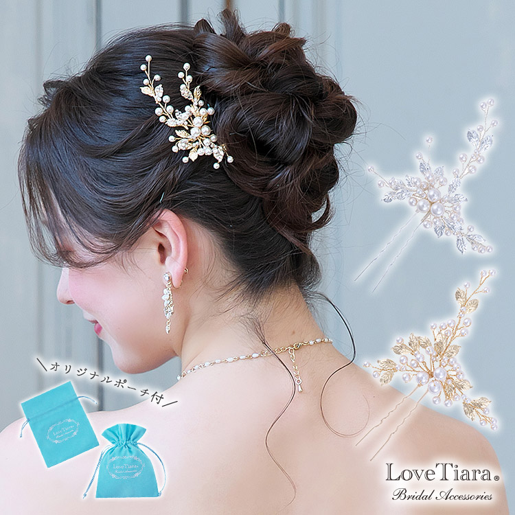 真鍮素材の光沢感があるリーフと、パールを編み込んだシンプルかつナチュラルなデザインです。
