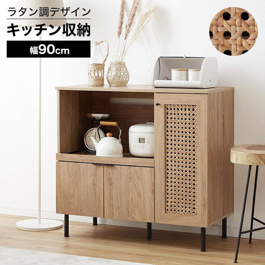 ラタン調デザインをさりげなくあしらったキッチンキャビネット[幅90cm]です。