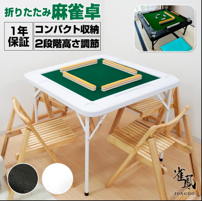 ONE STEP 雀鳳 麻雀卓 スリム 座卓 折りたたみ 家庭用 麻雀台三人打ち 麻雀 対応機種 三麻 麻雀テーブル 麻雀台 マージャン卓 父の日 敬老の日 プレゼント和室でも洋室でも大活躍!高さ2段階の麻雀テーブル登場!72cm or 39cmの2段階に調整OK椅子に座っても床に座ってもご利用いただけます。サイドテーブル不要!麻雀台にドリンクホルダー付きで置くところに困らない和室にも洋室にも合うシンプルなデザイン。家庭用としてインテリアに合わせて麻雀卓を設置いただけます。ダイニング、リビング、お座敷など場所を選ばずいつでも自宅で麻雀を楽しめる!雰囲気に合わせて座布団で囲うか、椅子に座って囲うか、その場で決めていただけます。家庭用/麻雀クラブ/麻雀教室/老人ホームなどに最適です。天版は(高密度ポリエチレンPEマテリアル)製ハニカム構造で丈夫で軽量なので持ち運びも楽チンです。麻雀マットは貼っていただく必要があります。収納式の麻雀卓なので不要時はスムーズに折りたたみOK家庭 麻雀クラブ 麻雀教室 老人ホームなどに最適。折りたたみ作業は女性一人でも簡単にできます。商品仕様本体サイズ(約):88幅cm×奥行88cm×高さ72cm収納サイズ(約):幅88cm×奥行88cm×高さ5cm重量(約):11kg高さ調整:2段階◆和室でも洋室でも大活躍!高さ2段階の麻雀テーブル登場!◆天版は(高密度ポリエチレンPEマテリアル)製◆収納式の麻雀卓で不要時はスムーズに折りたたみ可能。家庭/麻雀クラブ/麻雀教室/老人ホームなどに最適。折り畳み作業は女性一人でも簡単にできます。☆※麻雀牌は別売りです☆