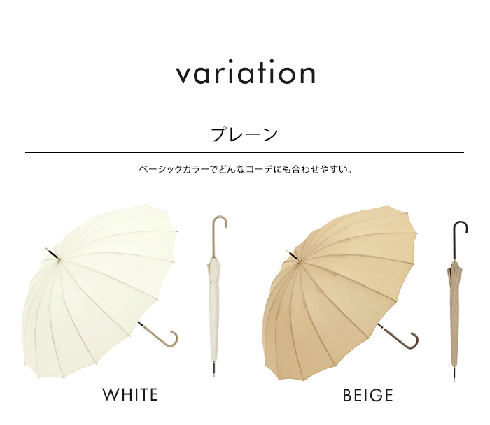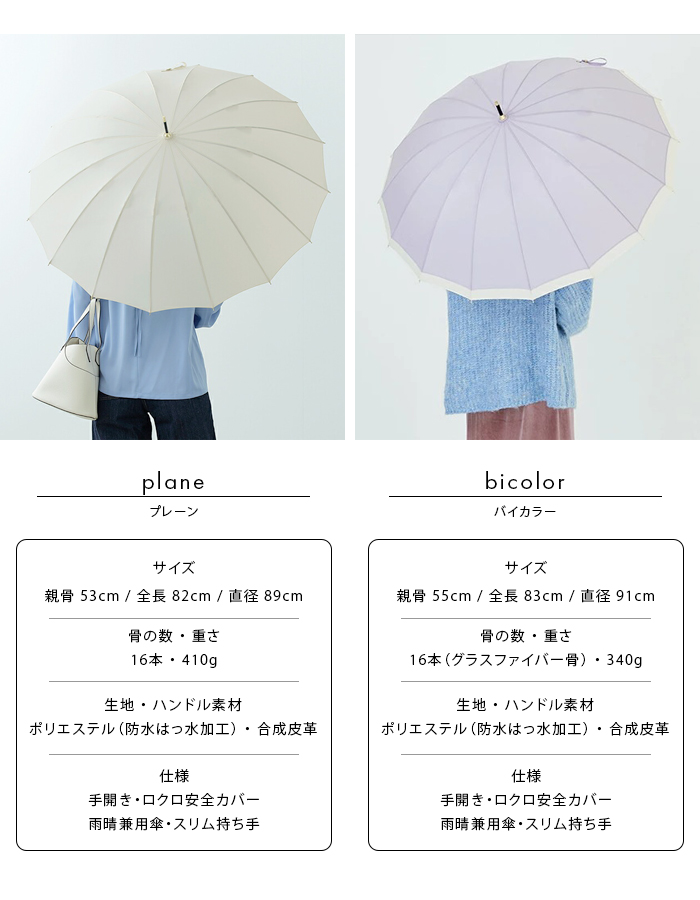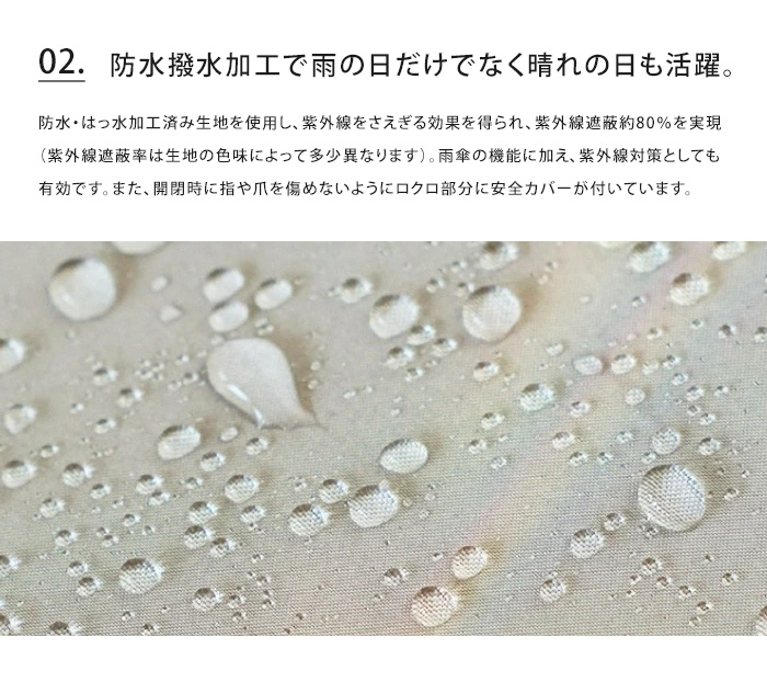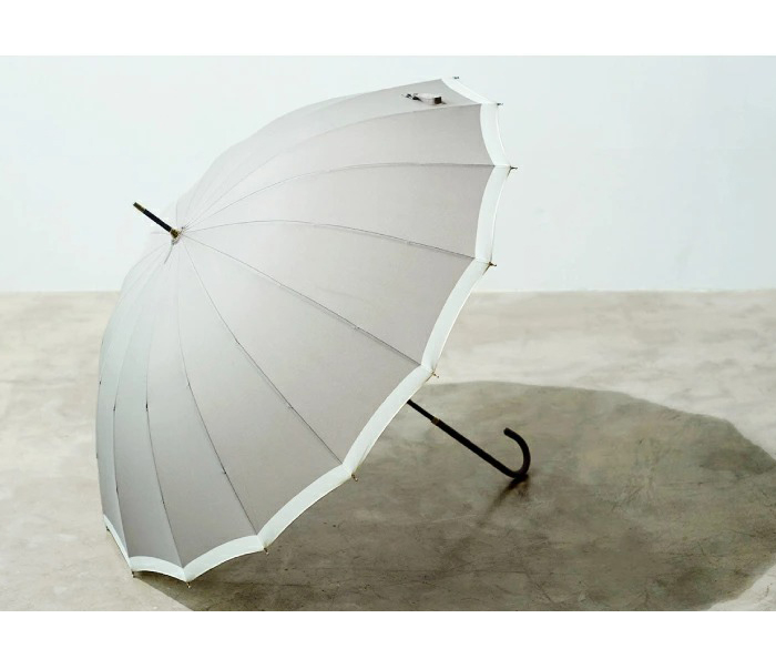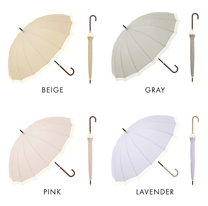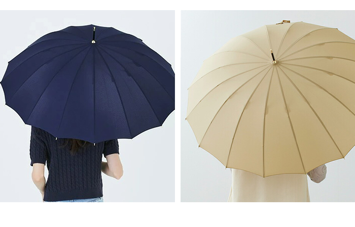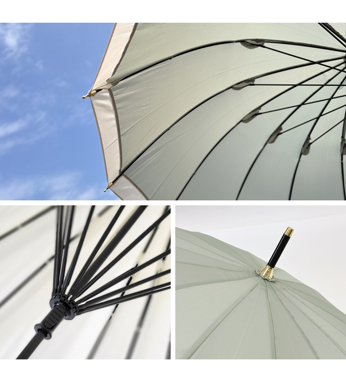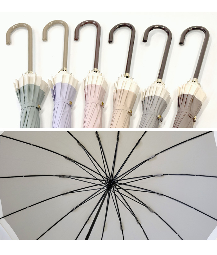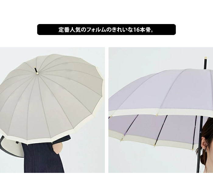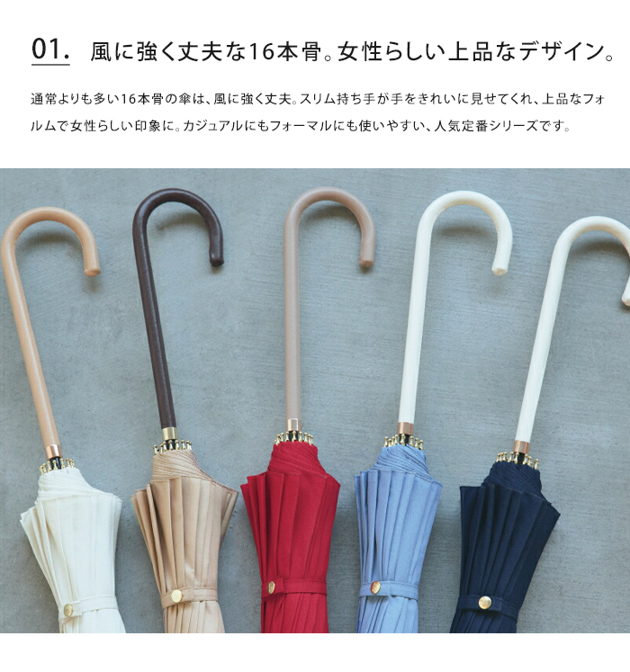 通常よりも多い16本骨の傘は、風に強く丈夫。スリム持ち手が手をきれいに見せてくれ、上品なフォルムで女性らしい印象に。カジュアルにもフォーマルにも使いやすい、人気定番シリーズです。防水・はっ水加工済み生地を使用し、紫外線をさえぎる効果を得られ、紫外線遮蔽約80%を実現(紫外線遮蔽率は生地の色味によって多少異なります)。雨傘の機能に加え、紫外線対策としても有効です。開閉時に指や爪を傷めないようにロクロ部分に安全カバーが付いています。