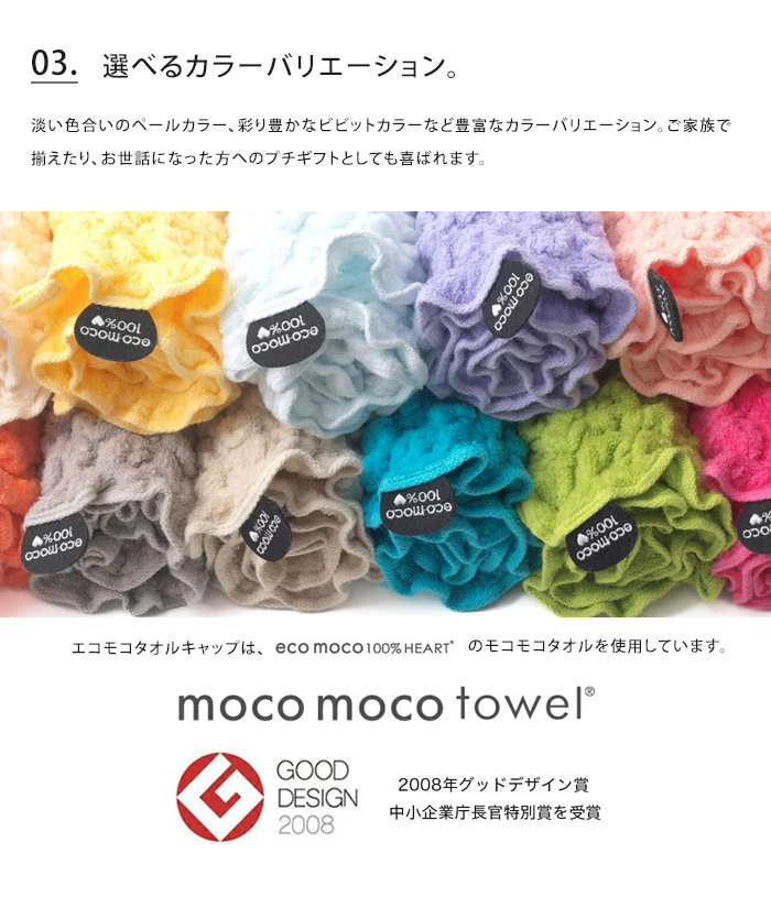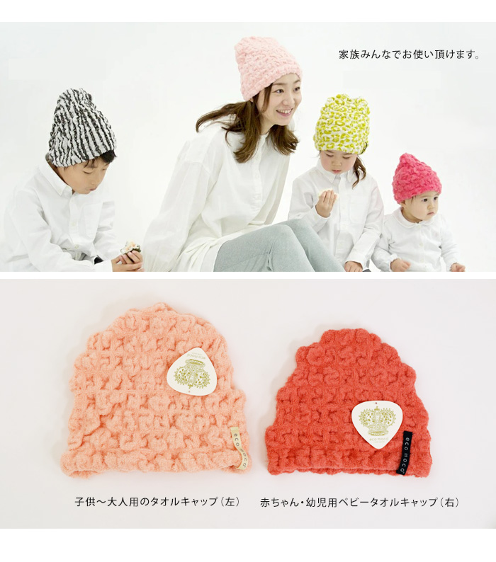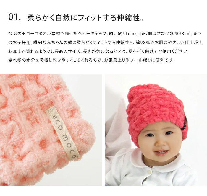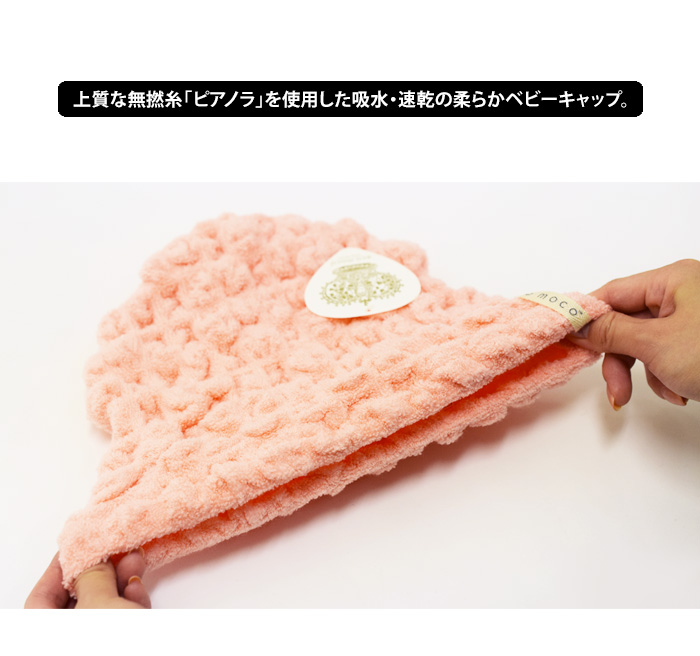 今治のモコモコタオル素材で作ったベビーキャップ。頭囲約51cm(目安/伸ばさない状態33cm)までのお子様用。繊細な赤ちゃんの頭に柔らかくフィットする伸縮性と、綿98%でお肌にやさしい仕上がり。濡れ髪の水分を吸収し乾きやすくしてくれるので、お風呂上りやプール帰りに便利です。クラボウ(株)との共同開発による無撚糸ピアノラを使用。吸水性や速乾性などの使用感も追求した素材です。愛媛県今治市の森商事株式会社が開発した実用新案登録【第3086950号】表情や風合いがとても楽しいモコモコとした形状のエコモコ商品です。