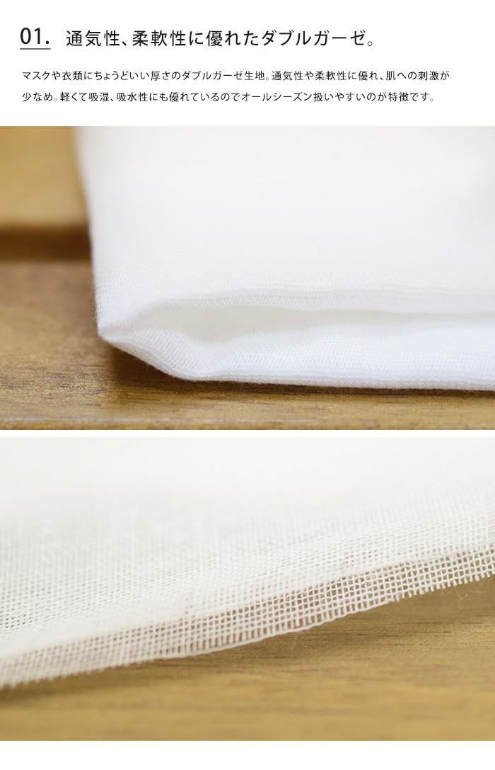 マスクや衣類にちょうどいい厚さのダブルガーゼ生地。通気性や柔軟性に優れ、肌への刺激が少なめ。