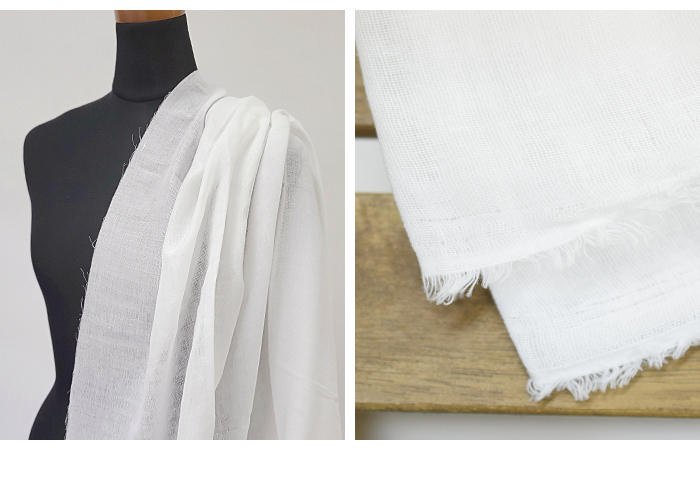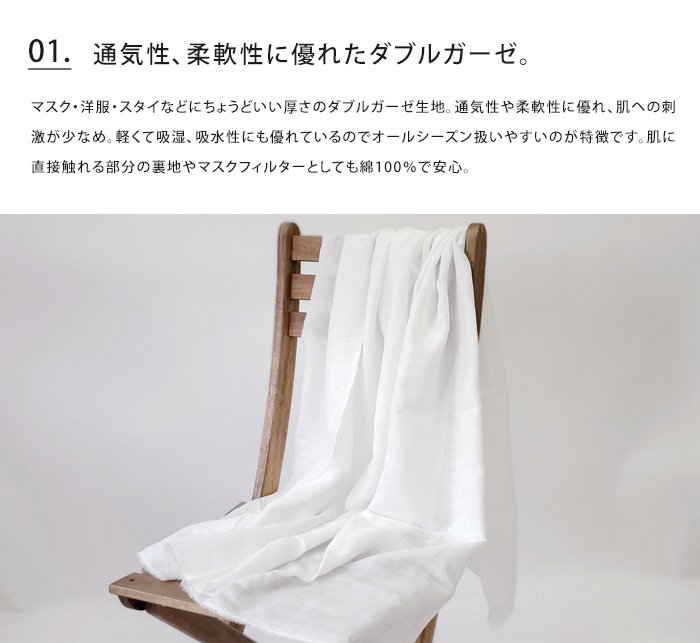 マスク・洋服・スタイなどにちょうどいい厚さのダブルガーゼ生地。通気性や柔軟性に優れ、肌への刺激が少なめ。軽くて吸湿、吸水性にも優れているのでオールシーズン扱いやすいのが特徴です。肌に直接触れる部分の裏地やマスクフィルターとしても綿100%で安心。