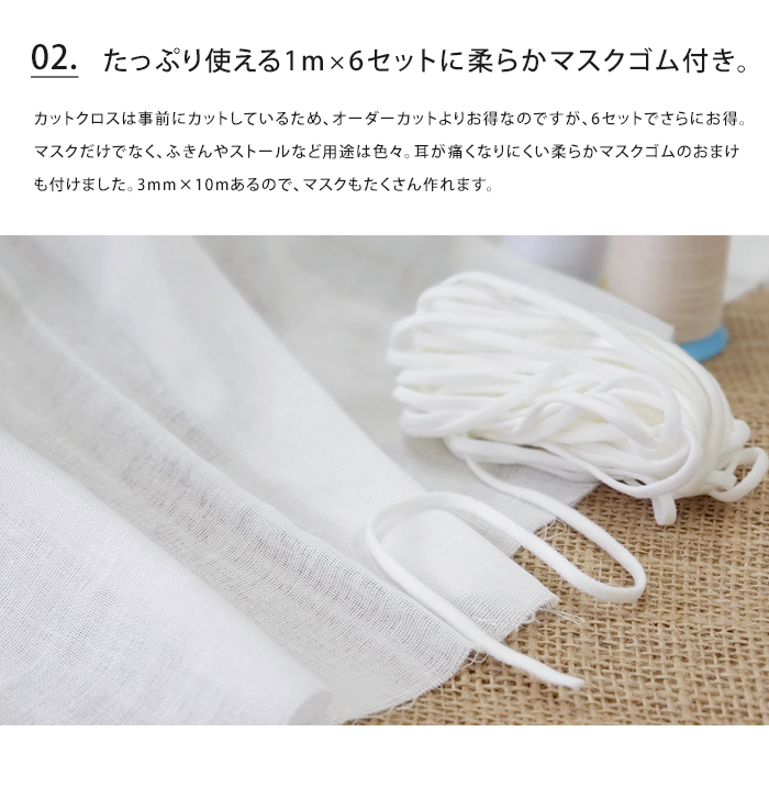 カットクロスは事前にカットしているため、オーダーカットよりお得なのですが、6セットでさらにお得。マスクだけでなく、ふきんやストールなど用途は色々。耳が痛くなりにくい柔らかマスクゴムのおまけも付けました。3mm×10mあるので、マスクもたくさん作れます。