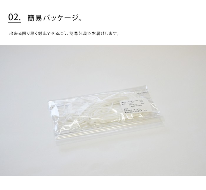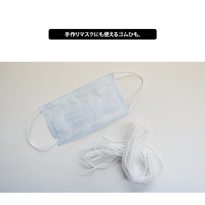 約3mm×10mのホワイトゴム紐。ふんわりとした柔らかめのゴムひもなので耳が痛くなりにくく、