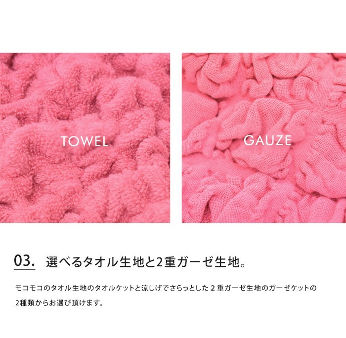 柔かく吸水性抜群の無撚糸モコモコタオルを使用したエコモコオリジナルのタオルケットとさらりと肌触りのいい涼しげな2重ガーゼケット。タテ糸とヨコ糸に伸縮糸を織り込んでいるため、体に優しくフィット。程よい重みで包み込み、心地よい眠りへ導いてくれます。