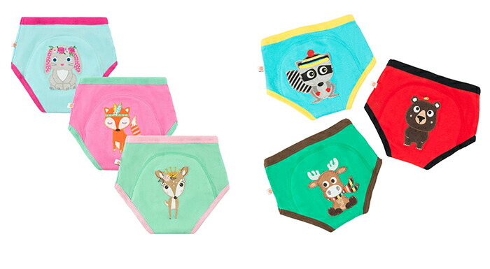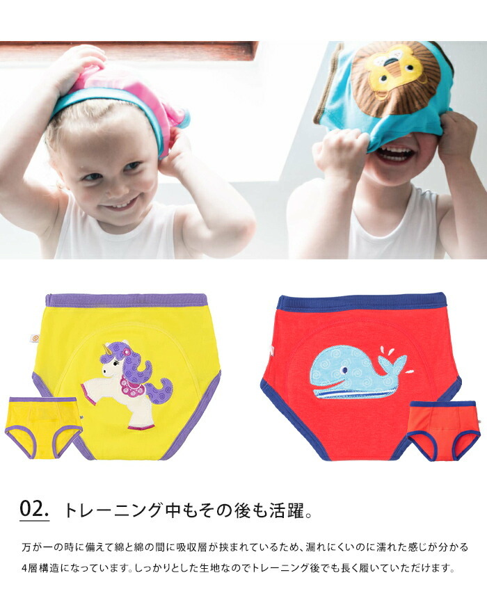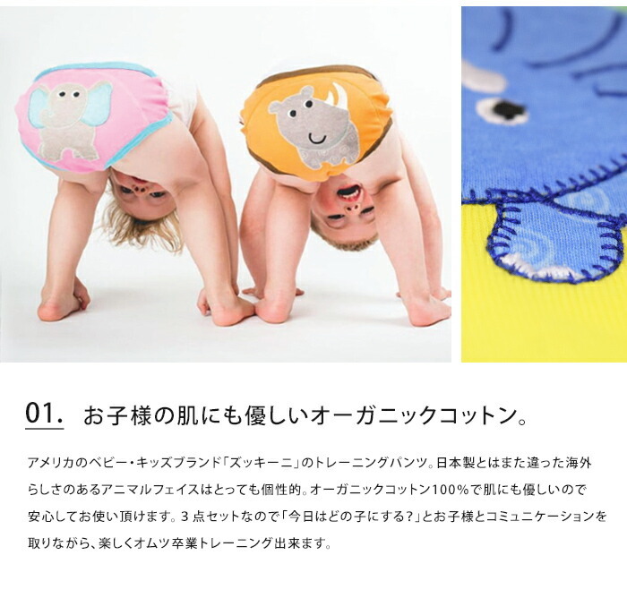 アメリカのベビー・キッズブランド「ズッキーニ」のトレーニングパンツ。日本製とはまた違った海外らしさのあるアニマルフェイスはとっても個性的。オーガニックコットン100%で肌にも優しいので安心してお使い頂けます。3点セットなので「今日はどの子にする?」とお子様とコミュニケーションを取りながら、楽しくオムツ卒業トレーニング出来ます。万が一の時に備えて綿と綿の間に吸収層が挟まれているため、漏れにくいのに濡れた感じが分かる4層構造になっています。しっかりとした生地なのでトレーニング後でも長く履いていただけます。
