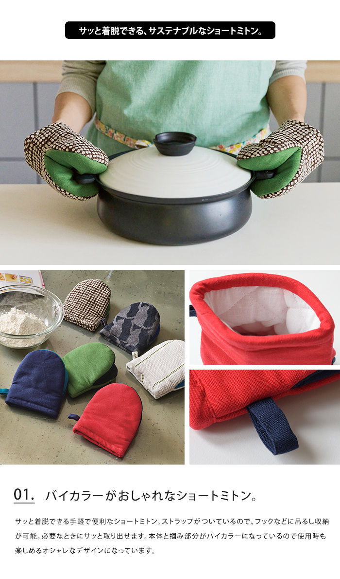 サッと着脱できる手軽で便利なショートミトン。製造工程上、どうしても出てしまう残反生地を活用して作られたアップサイクル商品です。残反ならではのバラエティに飛んだ生地のラインナップをお楽しみ下さい。ストラップがついているので、フックなどに吊るし収納が可能。必要なときにサッと取り出せます。本体と掴み部分がバイカラーになっているので使用時も楽しめるオシャレなデザインになっています。