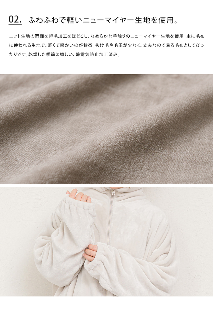 ふわふわで暖かい毛布のような生地が空気を含み、体をすっぽり包んで保温してくれる着る毛布は、寒い冬の必需品。自身を暖めることで、暖房代の節約にも。フェイスラインから膝までの丈感で、動きやすさと、脱ぎ着のしやすさ動きやすさ、両方をかなえます。ニット生地の両面を起毛加工をほどこし、なめらかな手触りのニューマイヤー生地を使用。主に毛布に使われる生地で、軽くて暖かいのが特徴。抜け毛や毛玉が少なく、丈夫なので着る毛布としてぴったりです。乾燥した季節に嬉しい、静電気防止加工済み。袖口はゴムが通っているので腕まくりすることができ、親指を通す穴が空いているので、手の甲まですっぽり包んで温めます。前開きのダブルファスナー式なので、着脱も簡単。◆サイズ(約)丈:100cm、幅:68cm◆素材ポリエステル100%◆モデル身長(約)160cm