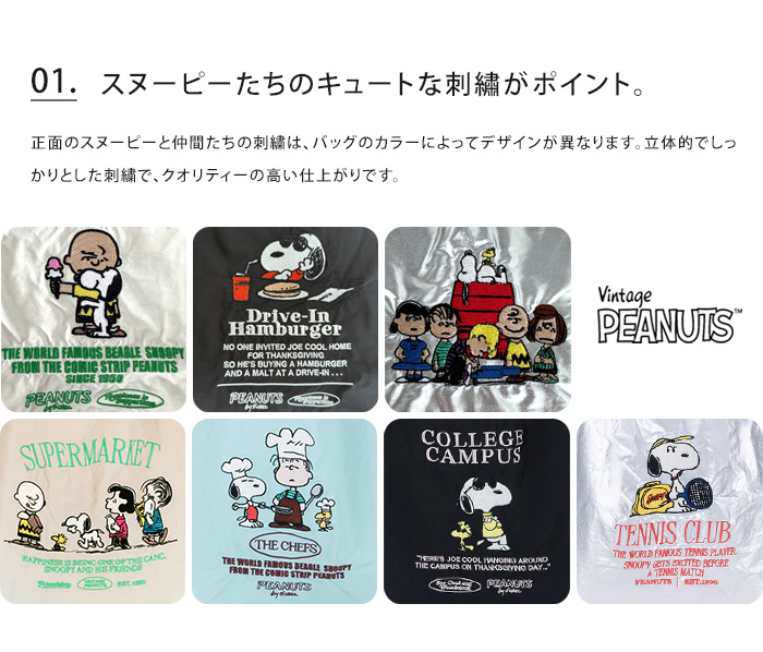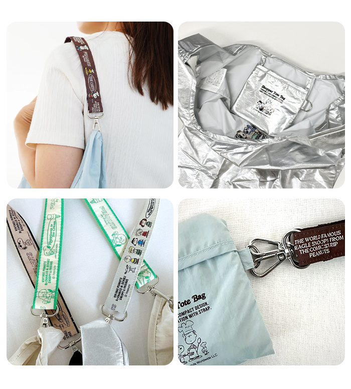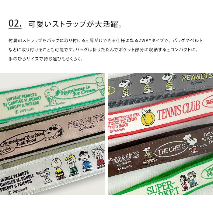 正面のスヌーピーと仲間たちの刺繍はバッグのカラーによってデザインが異なります。立体的でしっかりとした刺繍で、クオリティーの高い仕上がりです。付属のストラップをバッグに取り付けると肩がけできる仕様になる2WAYタイプで、 バッグやベルトなどに取り付けることも可能です。バッグは折りたたんでポケット部分に収納するとコンパクトに。手のひらサイズで持ち運びもらくらく。