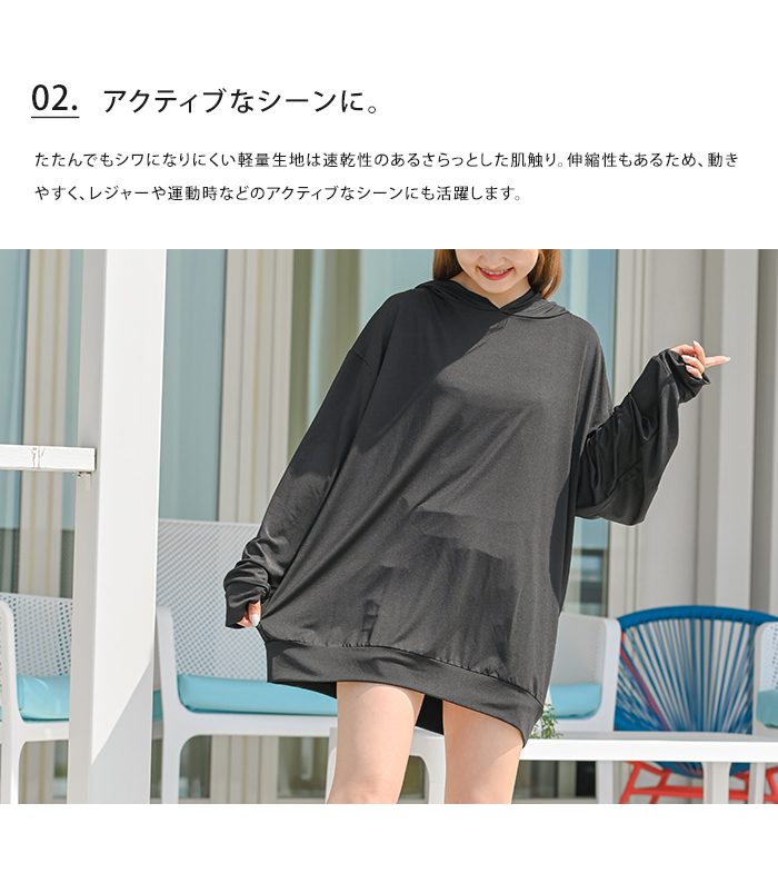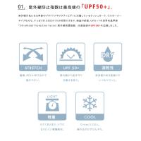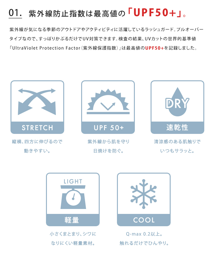 紫外線が気になる季節のアウトドアやアクティビティに活躍しているラッシュガード。プルオーバータイプなので、すっぽりかぶるだけでUV対策できます。検査の結果、UVカットの世界的基準値「UltraViolet Protection Factor(紫外線保護指数)」は最高値のUPF50+を記録しました。たたんでもシワになりにくい軽量生地は速乾性のあるさらっとした肌触り。伸縮性もあるため、動きやすく、レジャーや運動時などのアクティブなシーンにも活躍します。