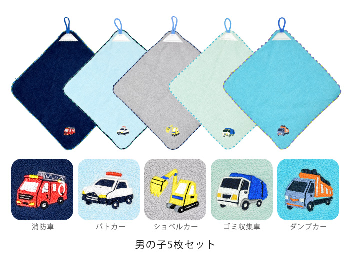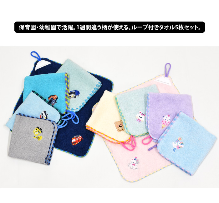 保育園や幼稚園で活躍するループ付きタオル。毎日使うものだから、洗い替えも一緒に購入できるお得な5枚セット。5枚あれば月〜金曜日まで違う柄が使えるので便利です。入園などの、ちょっとしたお祝いプレゼント・ギフトにもオススメです。肌に触れても安心の綿100%素材。2色のパイピングと動物や食べ物・乗り物の刺しゅうがポイント。タオルをループで掛けておくことが多い保育園や幼稚園。刺しゅうとループのすぐ下にお名前ラベルが目印になり、並んで掛かっていても分かりやすくなっています。