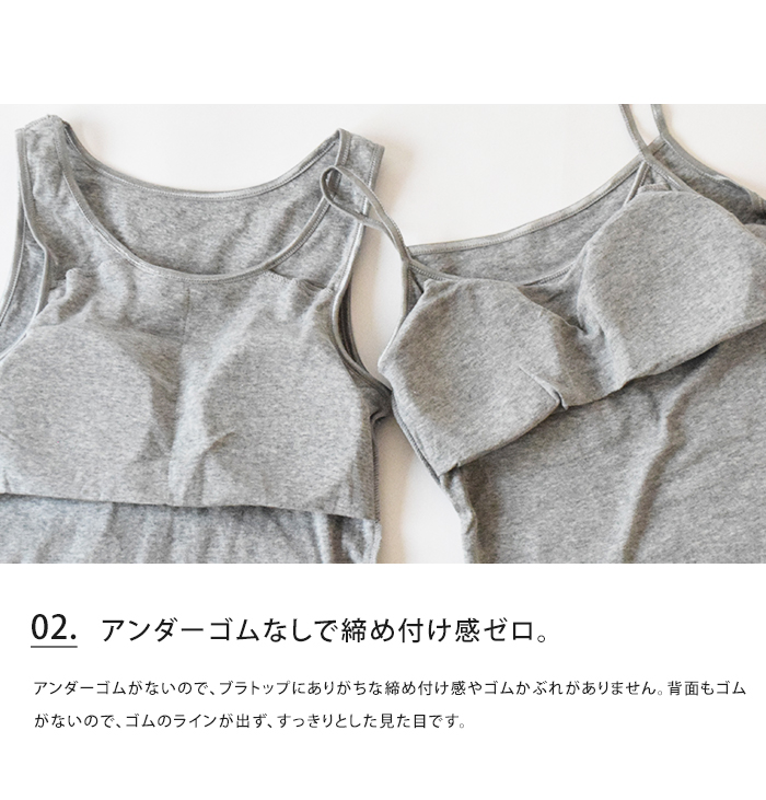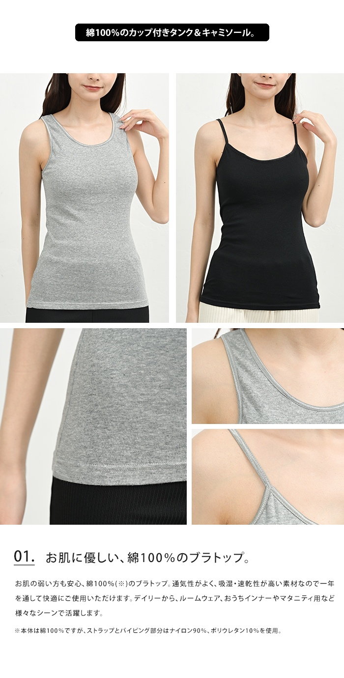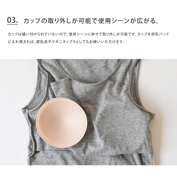 お肌の弱い方も安心、綿100%のブラトップ。通気性がよく、吸湿・速乾性が高い素材なので一年を通して快適にご使用いただけます。アンダーゴムがないので、ブラトップにありがちな締め付け感やゴムかぶれがありません。カップは使用シーンに併せて取り外しが可能。デイリーから、ルームウェア、おうちインナーやマタニティ用など様々なシーンで活躍します。