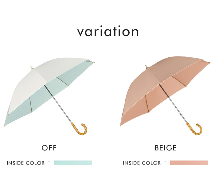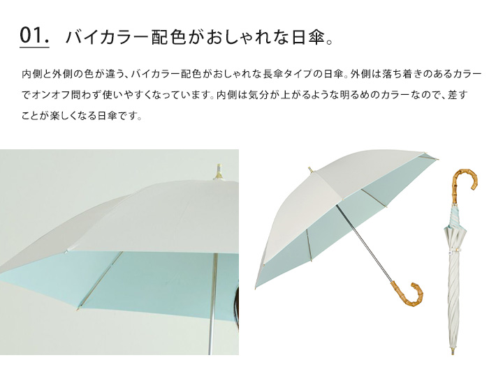内側と外側の色が違う、バイカラー配色がおしゃれな日傘。外側は落ち着きのあるカラーでオンオフ問わず使いやすくなっています。内側は気分が上がるような明るめのカラーなので、差すことが楽しくなる日傘です。日傘をおしゃれに持ちたい方にオススメの長傘タイプです。