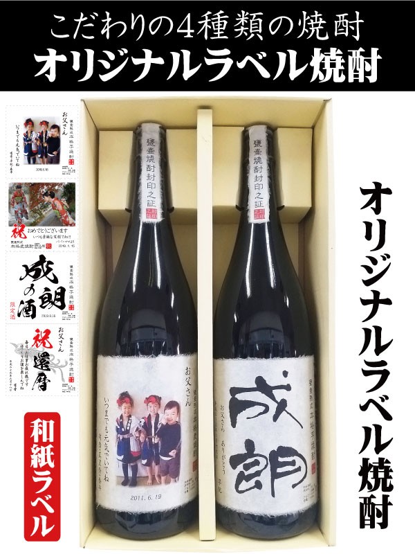 焼酎 名入れ プレゼント 写真入り ラベル 出産 出産 結婚 還暦 古希 オリジナル和紙ラベル 焼酎「芋 麦 黒糖焼酎 琉球泡盛」1800ml 2本セット