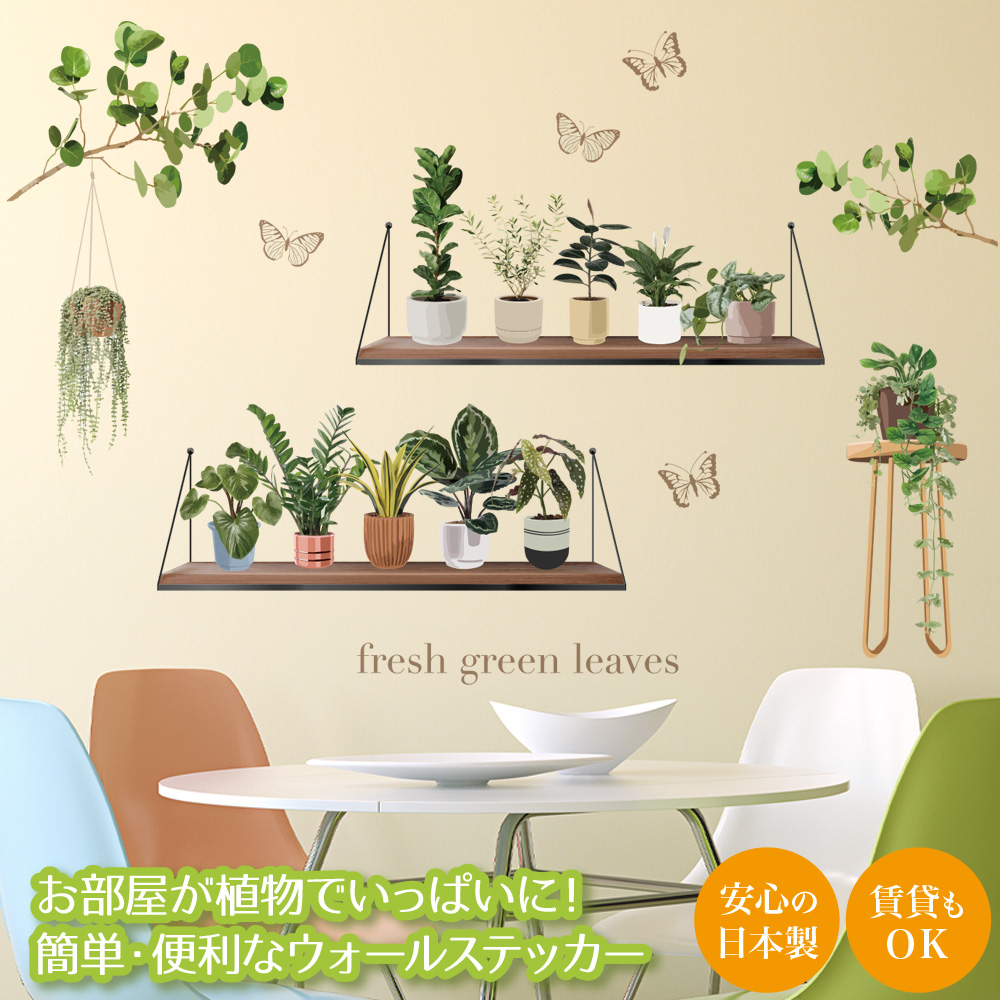安心の日本製ウォールステッカー 観葉植物を棚に飾ってお部屋を簡単・大変身!それぞれ個別に使用したり、自由にレイアウトして楽しめます。