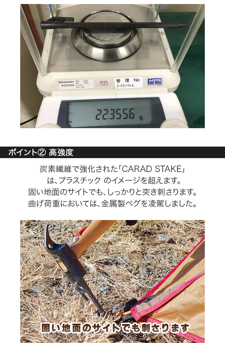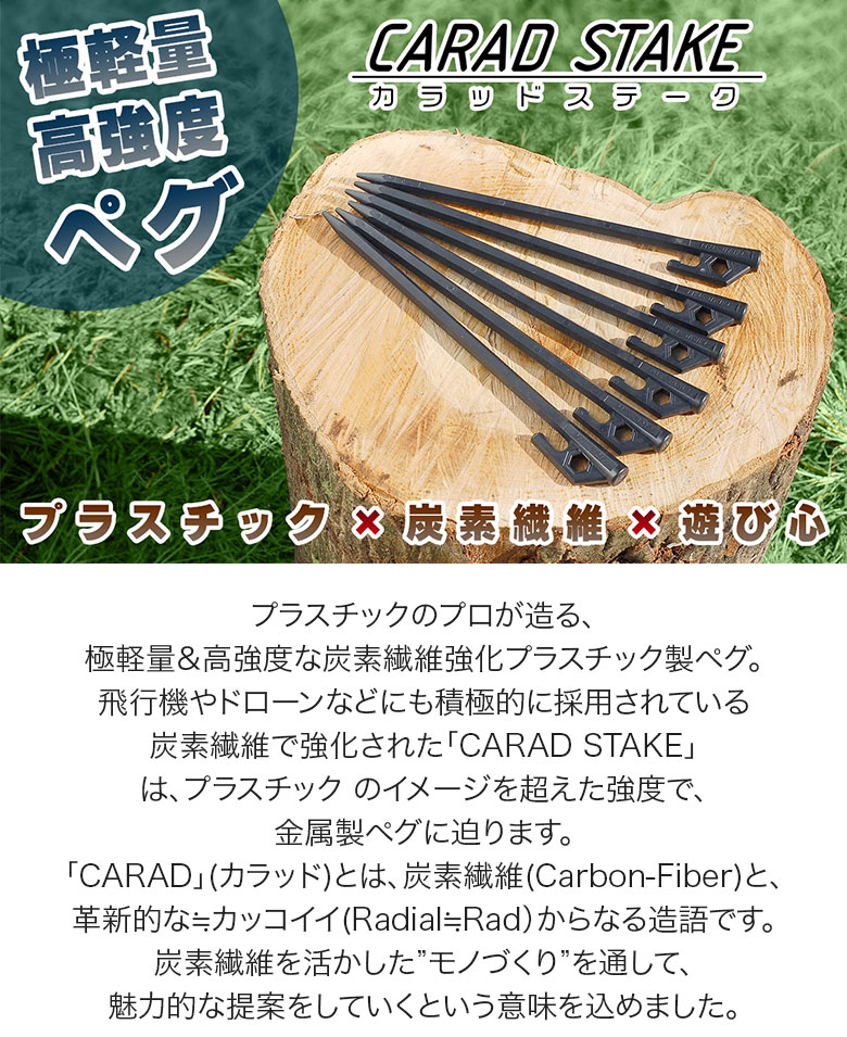 極軽量&高強度を実現した炭素繊維強化プラスチック製ペグ「CARAD STAKE」。