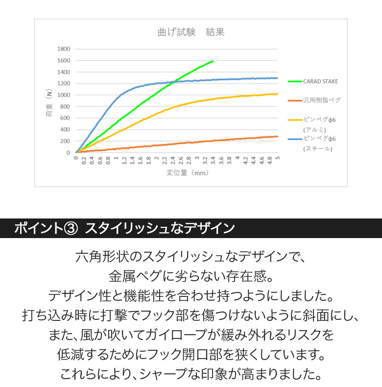 固い地面のサイトでも、しっかりと突き刺さります。曲げ荷重においては、金属製ペグを凌駕しました。