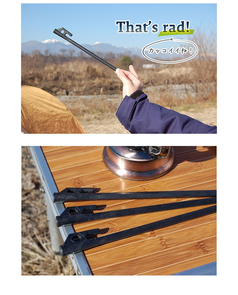 [ご使用上の注意点]・キャンプ用テントやタープ張設用のペグです。他の用途には使用しないでください。