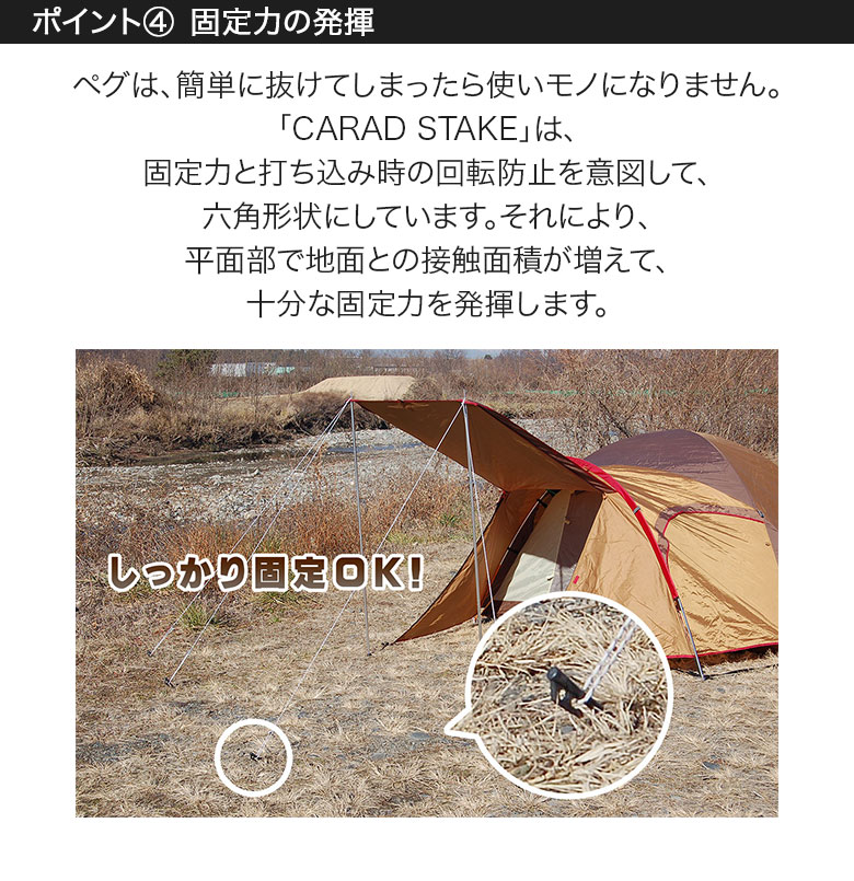 ペグは、簡単に抜けてしまったら使いモノになりません。「CARAD STAKE」は、固定力と打ち込み時の回転防止を意図して、六角形状にしています。それにより、平面部で地面との接触面積が増えて、十分な固定力を発揮します。