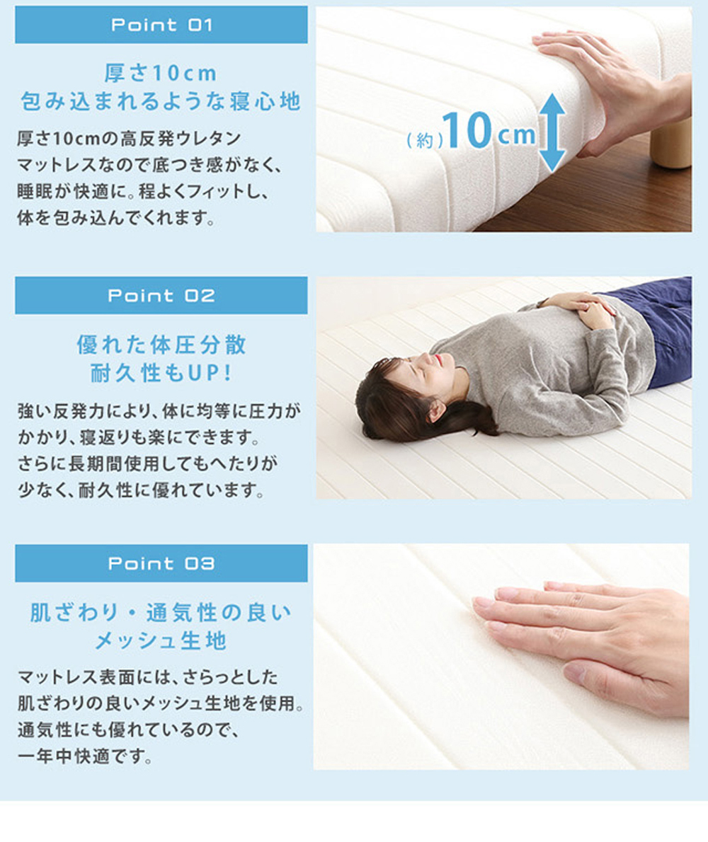 耐久性にも優れた頑丈設計でほどよい弾力かつ安定感のある寝心地のウレタンマットレスです。