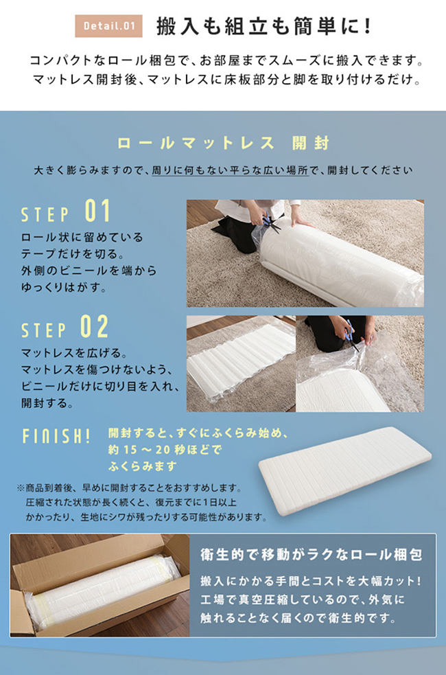 ロール梱包でのお届けなのでお部屋までスムーズに搬入可能、組み立ても簡単です!