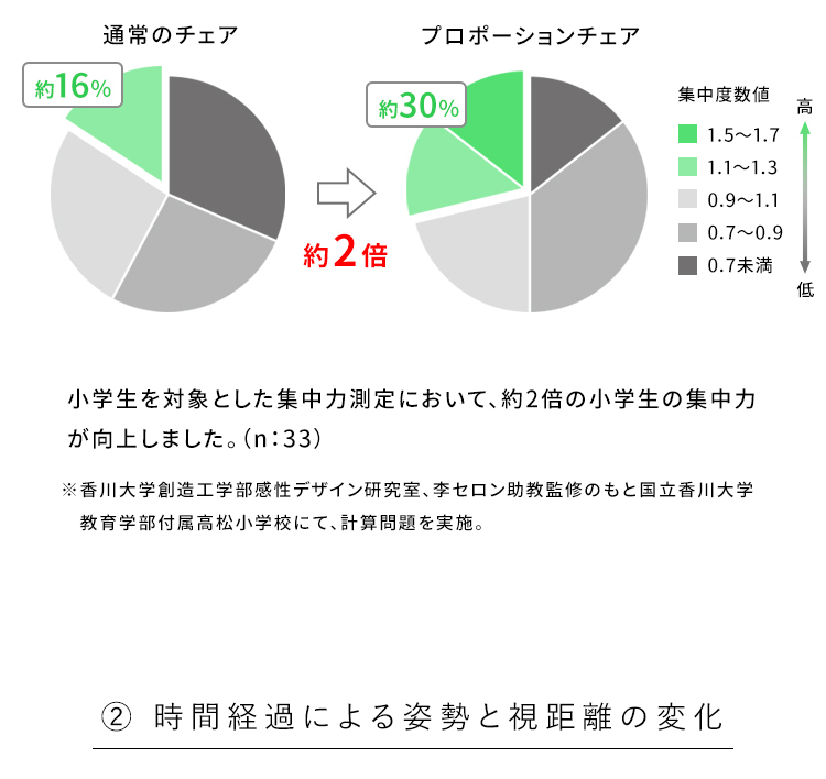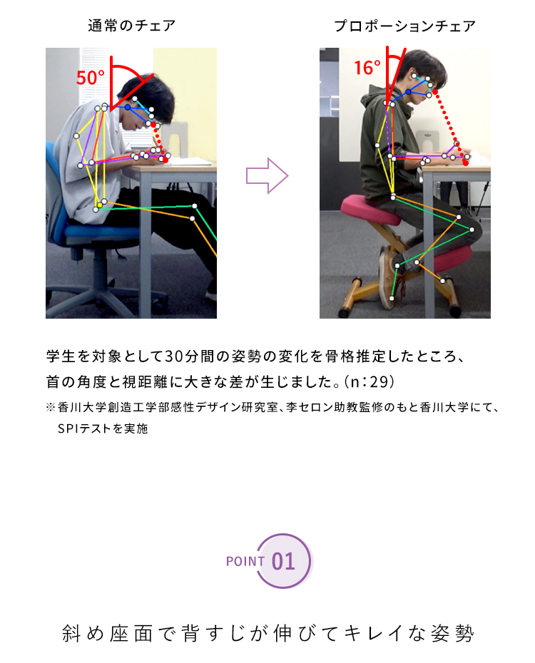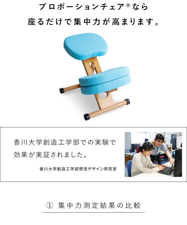 プロポーションチェア(R)なら座るだけで集中力が高まります。※香川大学創造工学部での実験で効果が実証されました。